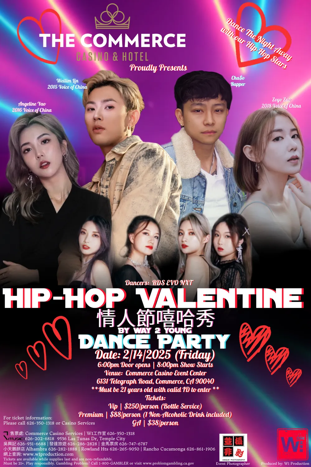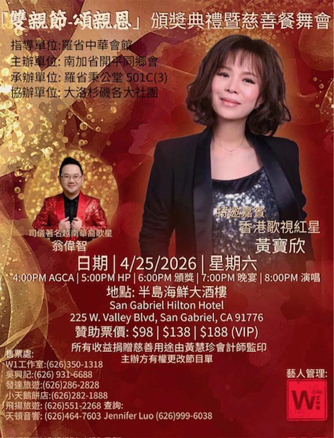 In the past, W1 Production has hosted many sold-out concerts, dinner galas, events & singing contests. We have provided local supporting services to singers/artists from overseas, taking care of them on the production, venue and even the visa applications to perform in the United States.